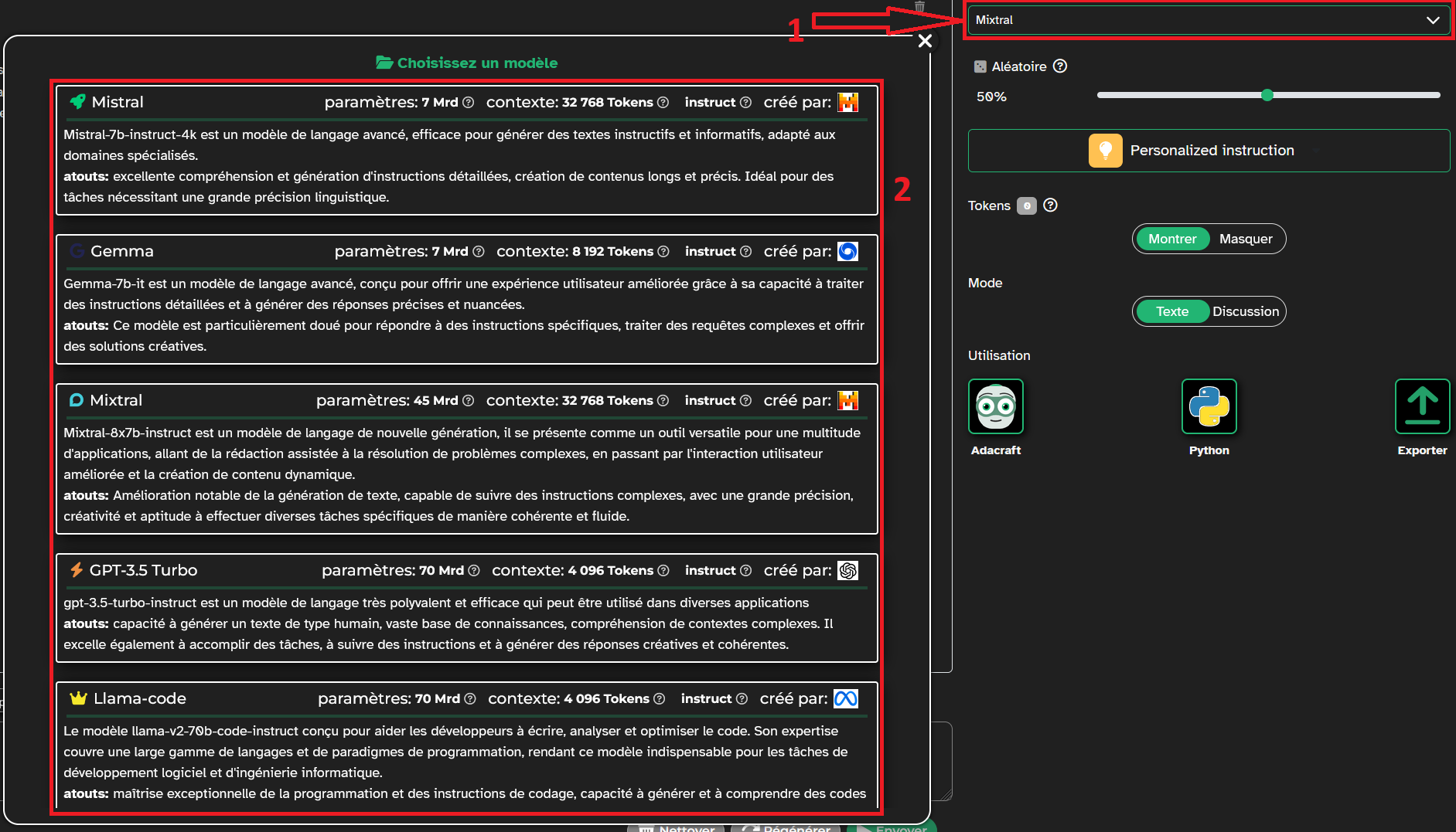 - dans une même interface, on peut utiliser différents modèles de langage, ce qui permet donc de comparer les résultats obtenus entre eux;