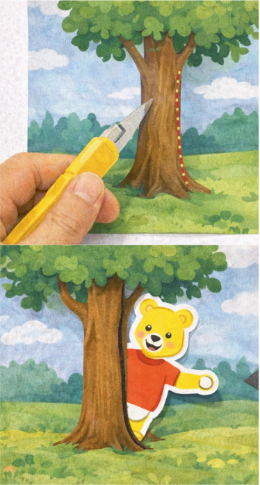 Découper légèrement le contour d’un élément du décor (par exemple un arbre) avec un cutter, glisser le personnage derrière et le faire apparaître progressivement.